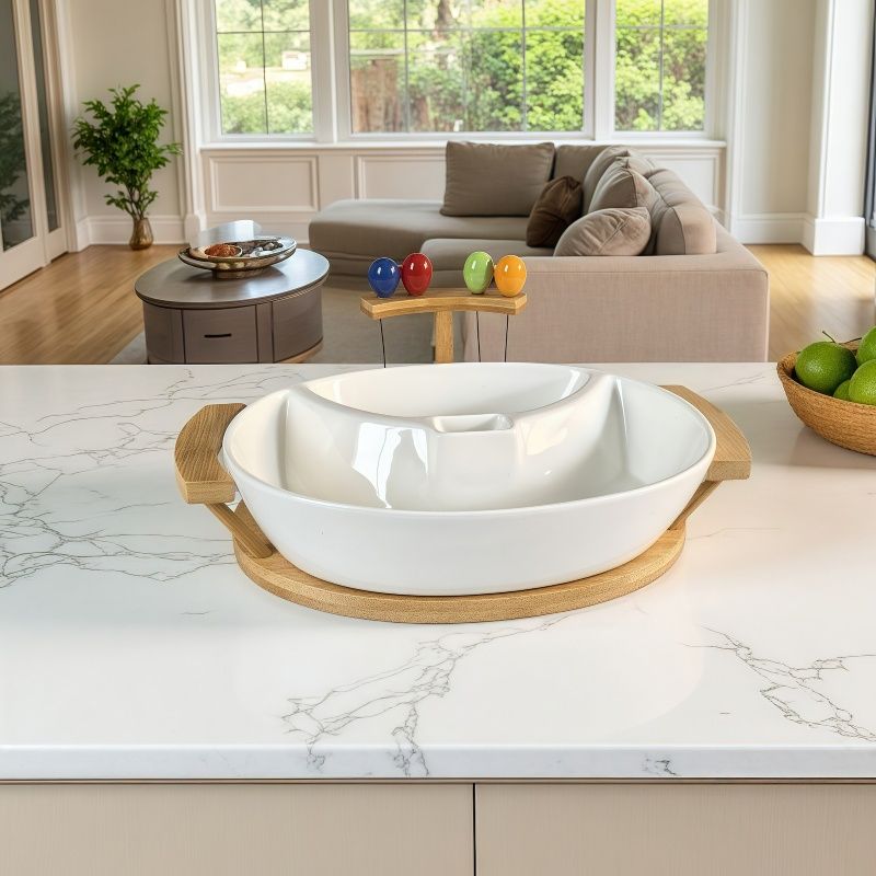 Артикулите от серия ВКУСЪТ НА ДОМА са красиви, но преди всичко практични за употреба. Те са удобни за ежедневието ви, като използването им ще се превърне в ритуал на удоволствието. Всички изделия са направени от качествени материали, а елементите от бамбук подчертават естествените материали при производството им. Този ордьовър е чудесен начин да допълните вкусовете на трапезата и всеки да открие своя. Виличките са допълнение за удобство, а порцелана с качеството си ще изпъкне на трапезата по най-добрия начин.