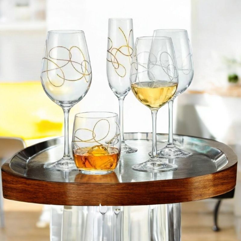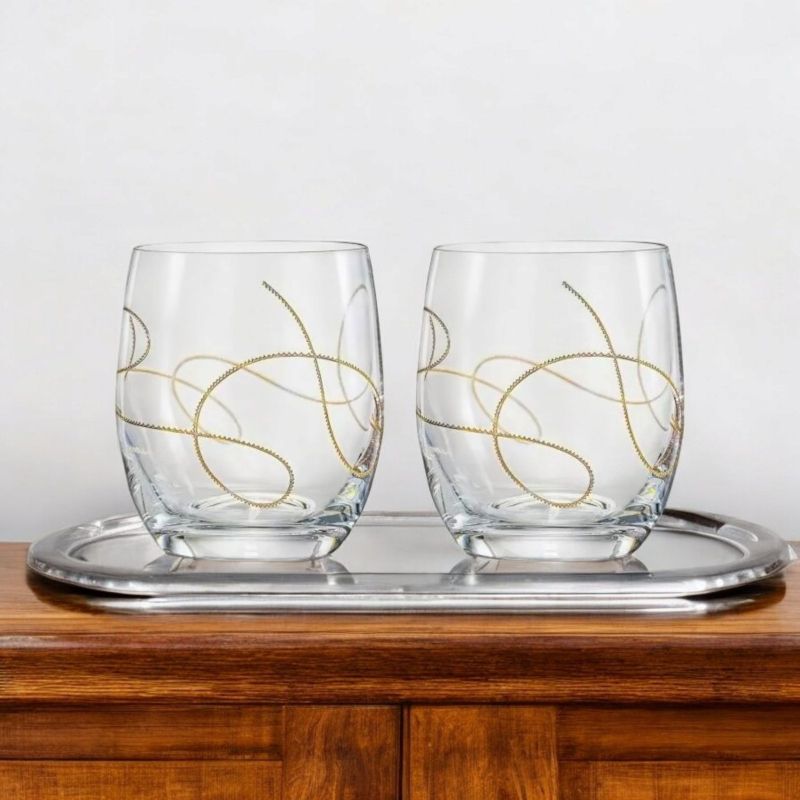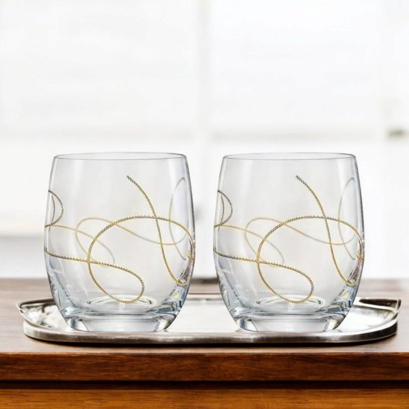 Комплектът включва: 2 броя чаши с гладки стени, прозрачен цвят с нежна флорална златна гравюра.