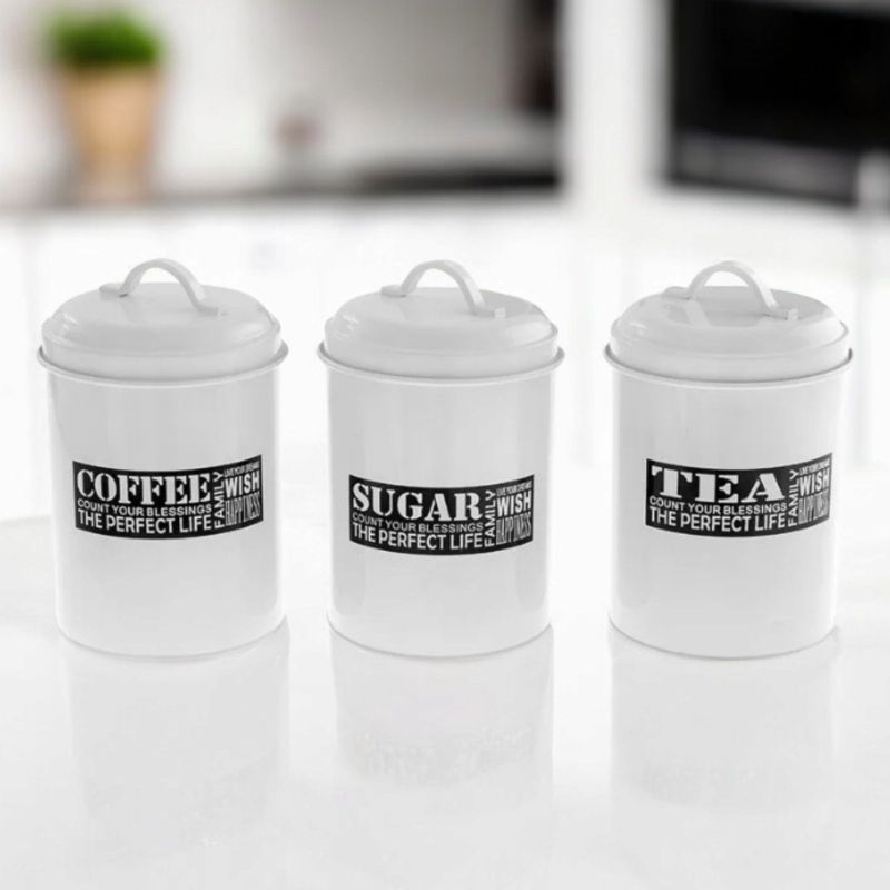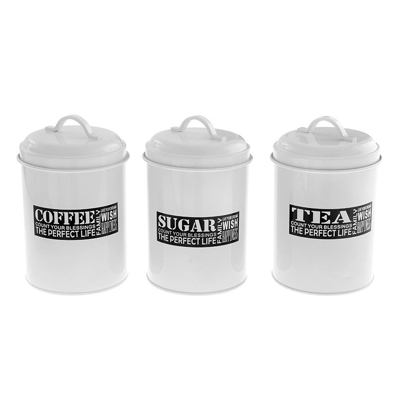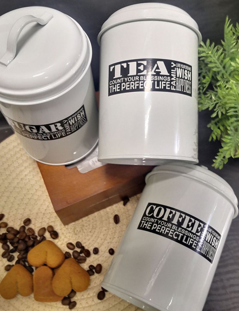 Красив и стилен комплект 3 метални буркана с капачета.Надписите за кафе, захар и чай ще ви ориентиран винаги за съдържанието им вътре.Имате ли страх от стъклото, когато готвите , вземете метал.Бурканите са отлично място за съхранение и добро попълнение за кухнята ви,като визия. Размер-16,5см*11см*11см.Материал-метал.